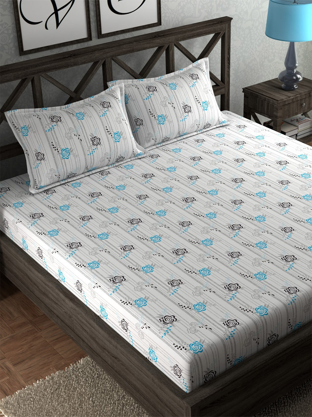CHHAVI INDIA White & Blue Floral 210 TC Queen Bedsheet with 2 Pillow Covers
