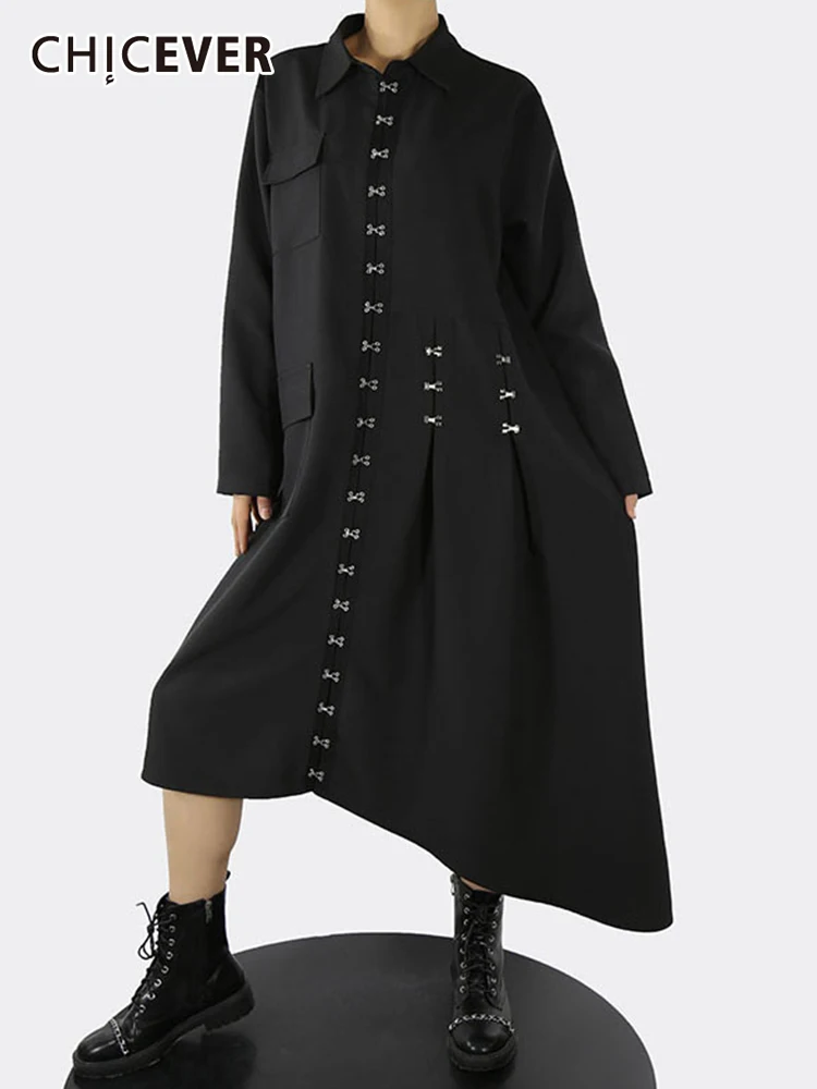 CHICEVER, черное лоскутное платье с асимметричным подолом для женщин, с отворотом, с длинным рукавом, прямые свободные платья для женщин, осень ...
