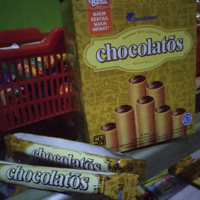 Chocolatos Classic Wafer Roll kemasan box isi 24 pcs. Ber-netto @9gr (short), merupakan wafer roll isi coklat dgn kelezatan coklat ala Italia. Sangat populer dimasyarakat Indonesia dan telah ekspor ke mancanegara. Di produksi oleh PT. Garudafood Putra Putri Jaya - Gresik (Biscuit Div). Enak, Murah meriah, dan praktis.