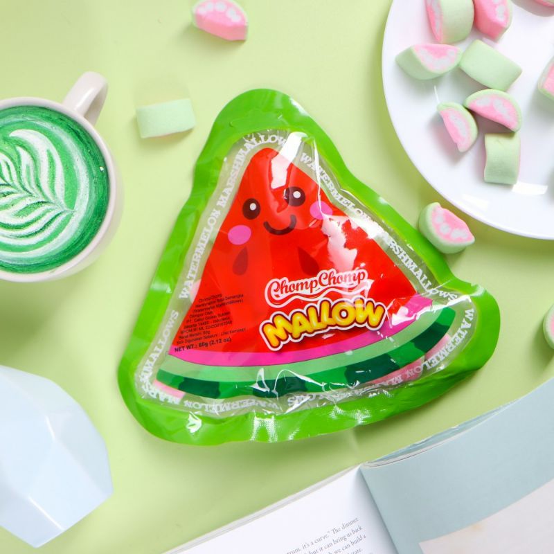 Chompshomp Marshmallow merupakan permen marshmallow rasa buah-buahan segar dengan bentuk yang unik dan nikmat yang diproses secara higenis dan dikemas secara praktis.