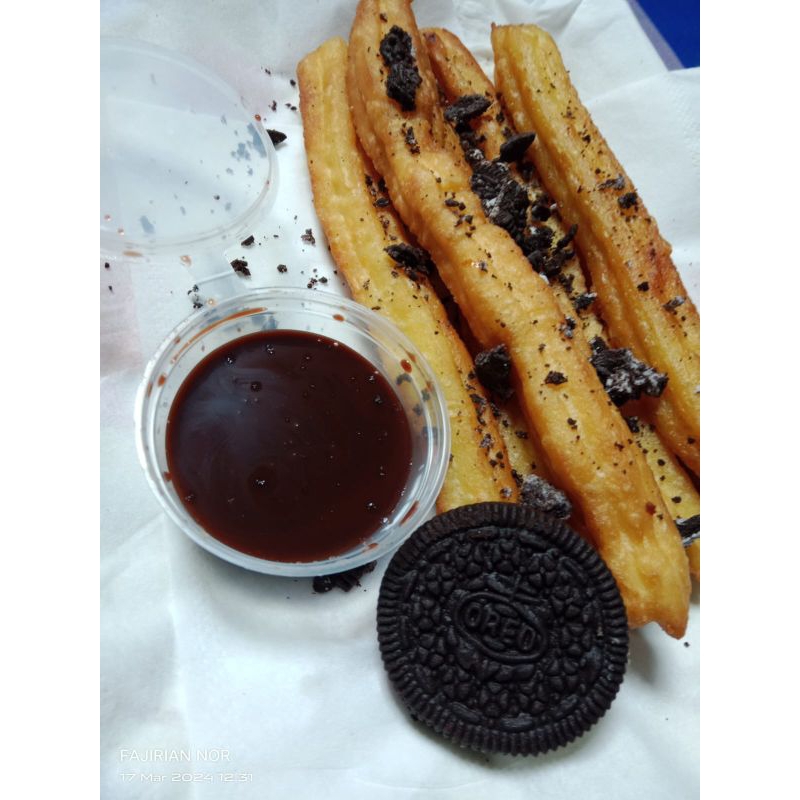 Churros jutos dengan toping oreo beserta cocolan coklat yang lembut sehingga menambah citra rasa yang menyatu menjadi satu di lidah masyarakat