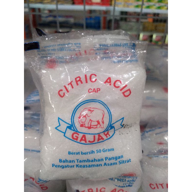 CITRUN / citric acid / asam sitrat cap GAJAH yang berukuran 50gr dalam satu sachet berfungsi sebagai pengatur keasaman pada makanan.