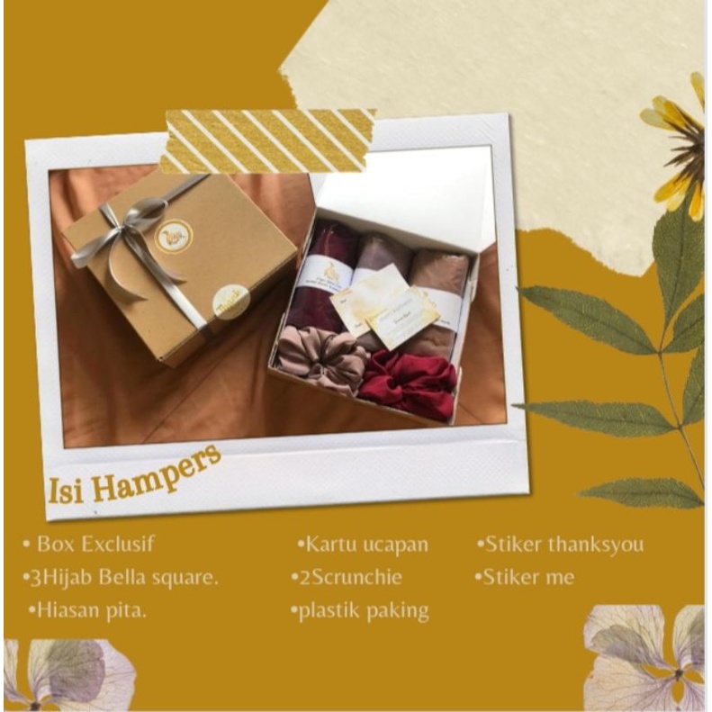 Hampers dikemas dengan dus packing yang menarik,rapi dan aman sehingga hampersmu terjaga kualitas isinya.Bisa pilih warna hijab,chat untuk ketersediaan stok Redy dan warna hijab ya. Jika tidak chat,bisa tulis di notes ingin warna krudung dan scruncie