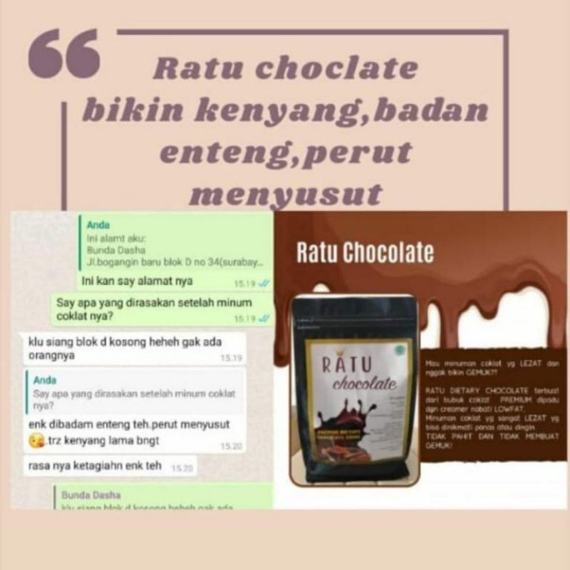 Ratu Dietary Chocolate terbuat dari bubuk coklat premium, dipadu dengan creamer nabati Lowfat. Minuman coklat yang sangat lezat yang bisa dinikmati panas atau dingin. Tidak pagit dan tidak membuat gemuk!