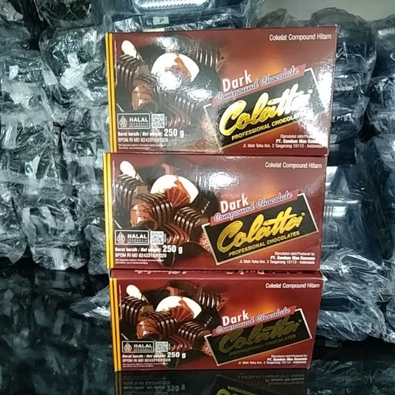 DCC merk Colatta kemasan 250 gram.Cokelat ini berjenis compound, yang berarti bukan cokelat murni, tetapi campuran antara cokelat dengan bahan tambahan lain. Bisa untuk hiasan kue, dicetak, diserut, isian kue, dll.