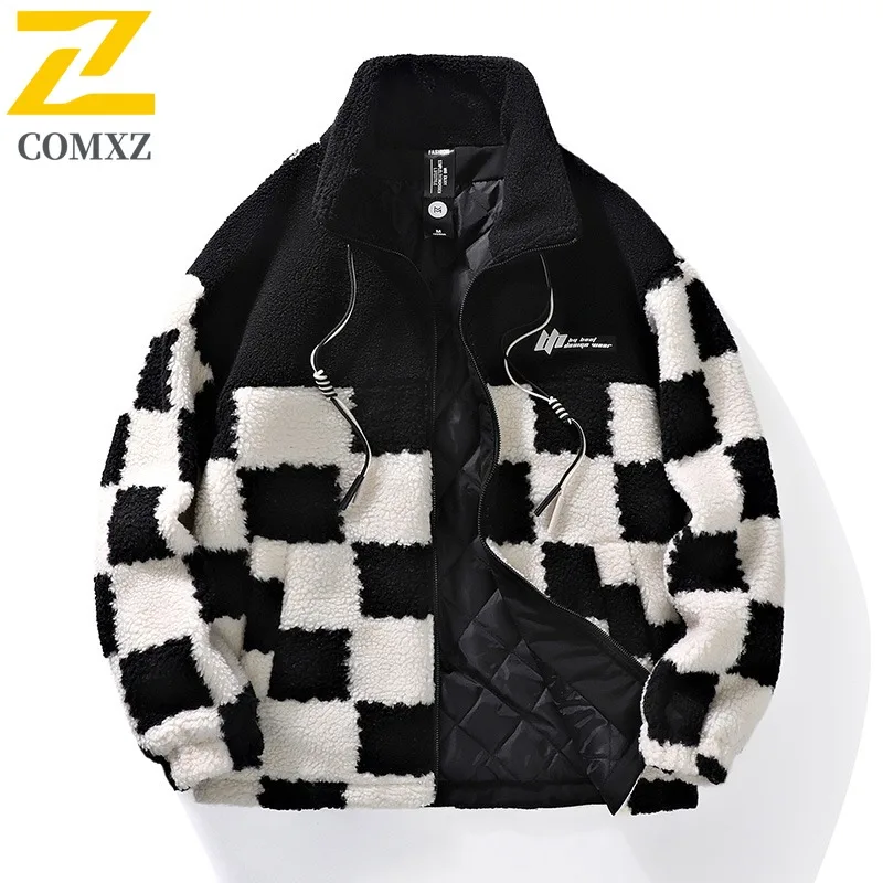 COMXZ 2025 клетчатая куртка шерпа, мужская зимняя толстая флисовая подкладка, молодежная флисовая плюшевая верхняя одежда, теплая модная уличная одежда, повседневная одежда