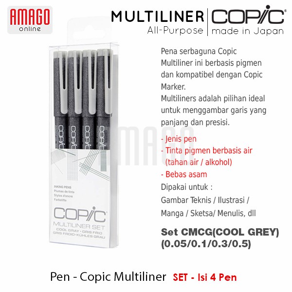 Pena serbaguna Copic Multiliner ini berbasis pikmen dan kompatibel dengan Copic Marker. Multiliner juga kedap-air, tinta tidak akan luntur oleh air setelah garis pena benar-benar kering.