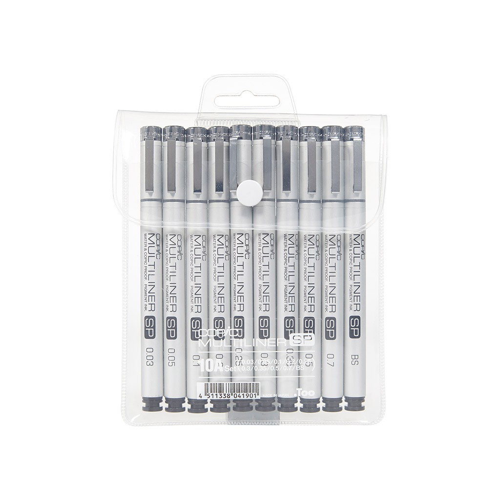 This set contains all 10 Multiliner SP sizes: 0.03mm, 0.05mm, 0.1mm, 0.2mm, 0.25mm, 0.3mm, 0.35mm, 0.5mm, 0.7mm, Brush