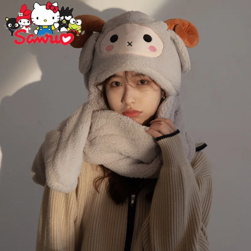 CSanrio плюшевые ягненок перчатки для рук и шеи шапка набор из трех предметов для студенток леди сетчатый шарф для защиты ушей в стиле знаменит...