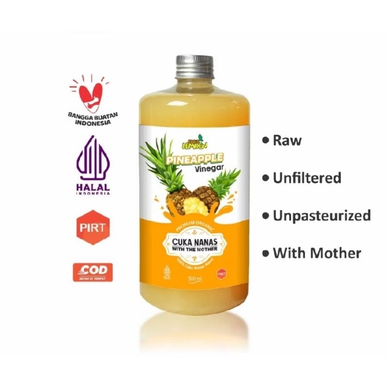 Cuka Nanas Organik dibuat dari buah nanas pilihan dengan sistem fermentasi alamiah, tanpa menggunakan zat kimia dan tanpa menggunaka ragi, tanpa pemanis, tanpa proses pasteurisasi dan masih mengandung ‘MOTHER’ atau yang sering disebut dengan inang cuka, dan mengandung bakteri probiotik baik atau enzyme.