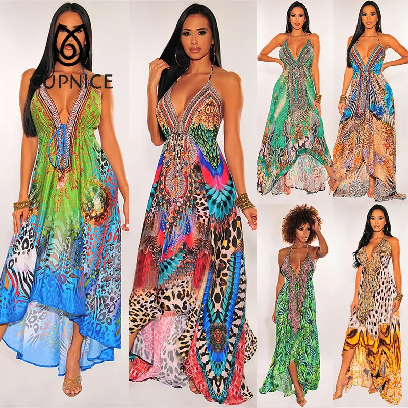 CUPNICE Ретро V-образный вырез сексуальная юбка с лямкой на шее женское платье с животным принтом Стразы вечернее платье для ночного клуба 2021 се...