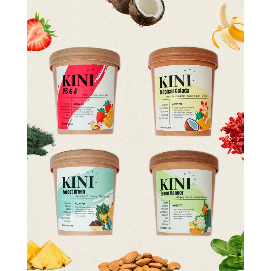 KINI CUSTOM 4 PACK ini adalah 4 Ready-to Blend smoothie cups yang kalian dapat memutuskan dari pilihan berikut :