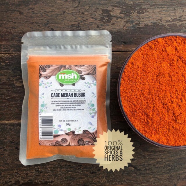 Cabe merah (capsicum annuum l var. abreviata eingerhuth) merupakan bumbu masak yang kaya akan kandungan vitamin c. Bahan makanan ini merupakan rempah pilihan, murni dari simplisa kering yang dikemas secara hygienis. Bubuk ini awet dan tahan lama untuk segala keperluan.