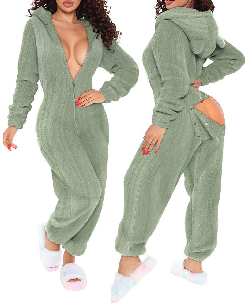 Cable Textured Zipper Fly Flap Hooded Onesie, Green