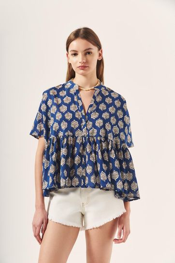 Camisa manga corta con cuello mao y escote en "V". Apertura frontal con botones y recorte en la cintura que le da vuelo a la prenda. Género estampado según impronta de la marca. Súper cool y de aires playeros.