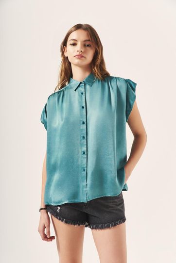 Camisa manga corta con detalle de dobladillo. Con botones al frente y cuello camisero, cuenta con pequeños fruncidos en frente y espalda que le otorgan fluidez a la prenda. Confeccionada en viscosa y teñida a mano, por lo cual cualquier variación es propia del trabajo artesanal. Un ítem de líneas limpias y netas, clásico y elegante, que combina de maravillas con tus jeans fav.