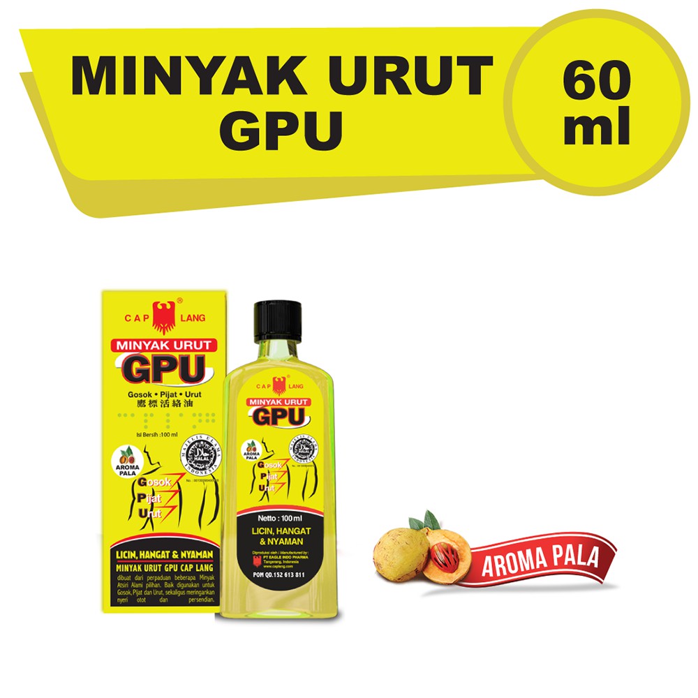 Minyak Urut GPU Pala Minyak Pala (Nutmeg Oil) berkhasiat untuk:- Meredakan capek dan pegal-pegal, gejala encok, serta nyeri sendi.- Aromaterapi untuk meredakan stressCara Pemakaian :-Keluarkan Produk dari kotak kemasan-Buka tutup botol yang memiliki secure lock-Tuang secukupnya ke telapak tangan terlebih dahulu atau langsung ke bagian yang membutuhkan .-Usap bagian tubuh yang membutuhkan secara merata, disertai dengan pijatan lembut ataupun dengan gerakan mengurut.Note : hanya untuk pemakaian luar.NOTE :*Pesanan yang sudah di klik selesei atau terima pesanan selesei tidak bisa di batalkan di return dengan alasan apapun.*Mohon buat Video Unboxing saat paket Diterima & Dibuka, kami tidak menerima komplain jika barang rusak/salah/kurang tanpa Video Unboxing*Pengembalian tidak dapat diproses apabila segel produk sudah terbuka.*Pengecekan batch akan dilakukan untuk memastikan barang tersebut di beli dari Official Cap Lang Store.*Dengan membeli produk di Cap Lang Store maka customer menyetujui prosedur ini.*Selamat berbelanja.