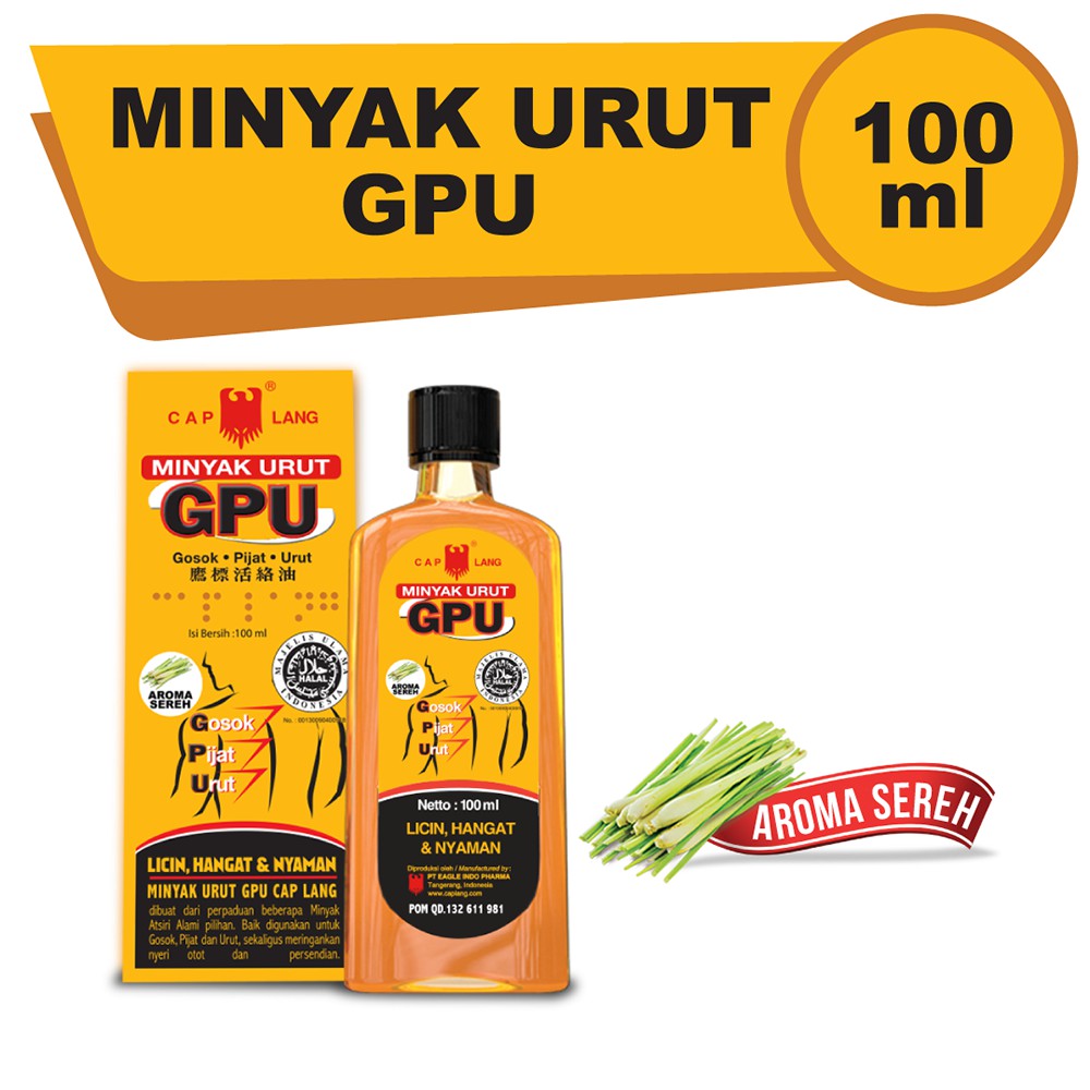 Minyak Urut GPU Sereh Minyak Sereh (Citronella Oil) berkhasiat untuk:- Meredakan pegal linu, keseleo, nyeri punggung, sendi, rematik.- Menghindari nyamuk Aromaterapi yang menenangkanCara pemakaian :-Keluarkan Produk dari kotak kemasan-Buka tutup botol yang memiliki secure lock-Tuang secukupnya ke telapak tangan terlebih dahulu atau langsung ke bagian yang membutuhkan .-Usap bagian tubuh yang membutuhkan secara merata, disertai dengan pijatan lembut ataupun dengan gerakan mengurut.NOTE :*Pesanan yang sudah di klik selesei atau terima pesanan selesei tidak bisa di batalkan di return dengan alasan apapun.*Mohon buat Video Unboxing saat paket Diterima & Dibuka, kami tidak menerima komplain jika barang rusak/salah/kurang tanpa Video Unboxing*Pengembalian tidak dapat diproses apabila segel produk sudah terbuka.*Pengecekan batch akan dilakukan untuk memastikan barang tersebut di beli dari Official Cap Lang Store.*Dengan membeli produk di Cap Lang Store maka customer menyetujui prosedur ini.*Selamat berbelanja.