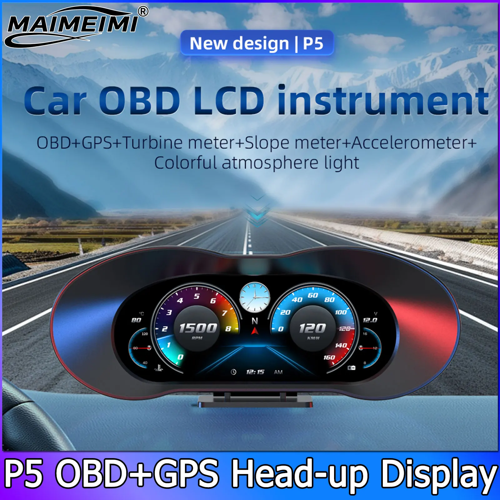Car P5 OBD2 GPS LCD HUD Speedometer Head Up Display Slope Meter on Board Computer Digital With Speed RPM Overspeed Alarm