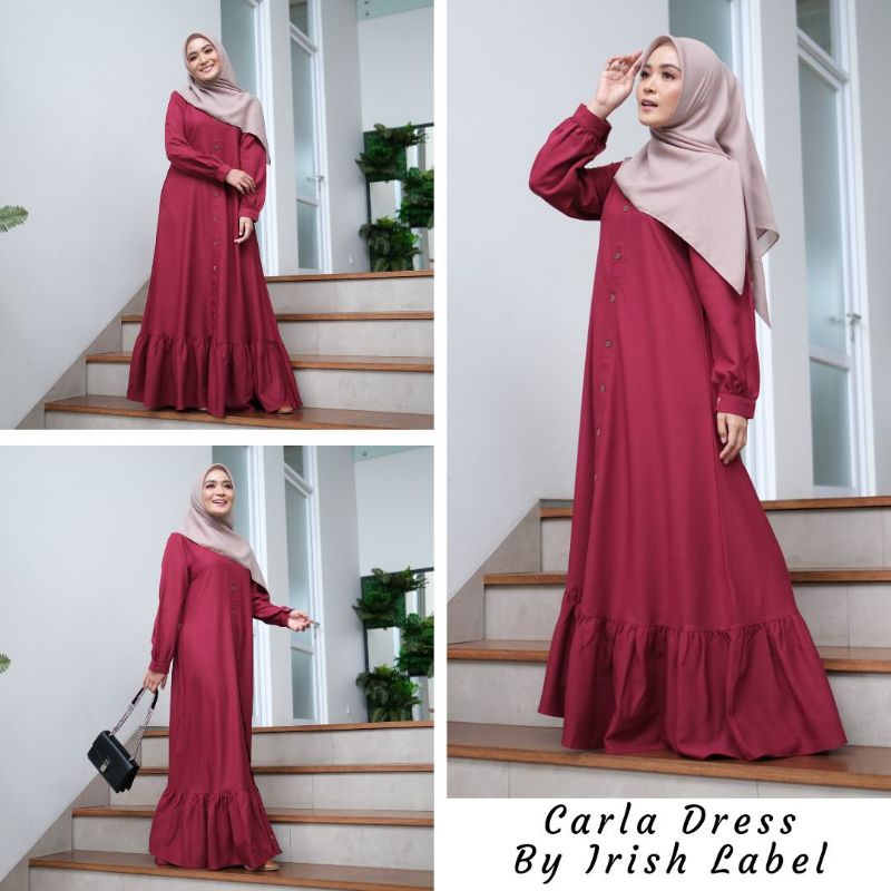 #carladress berbahan ladyzara yang sudah terkenal jatuh lembut tidak terawang dan pastinya adem dipakai.. Dress dari #irishlabel ini spesial banget dengan desain basic abaya full kancing dari atas sampai bawah, ditambah aksen kerut bagian bawah bikin look simple dan mewah ya..
