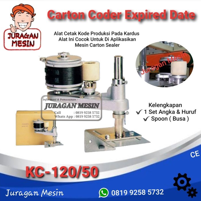 Carton coder (Alat cetak kode produksi kardus)Alat ini di apliksikan ke mesin carton sealer(lakban kardus).1 Set Angka1 Set Huruf1 spoon(busa)Spesifikasi :Buatan : LokalTipe : KC-120/50Diameter of Cylinder : 120 mmText Height : 50 mmMax Lenght of Text : 240 mmFor Carton Length : 20 - 52 cmBerat : 5,5 Kg*Mohon Konfirmasi stok sebelum melakukan pembelian barang Untuk pengiriman diluar jakarta, kami akan kirimkan melalui ekspedisi yang lebih murah seperti cobra, pahala ekspress, dakota dll, atau ekspedisi sesuai pilihan anda silakan pilih saja ekspedisi yang di sediakan,, nantinya ongkos kirim yang berlebih akan dikembalikan baik didalam paket maupun ditransfer langsung kepada anda Apabila Ingin Bertanya Tentang Produk Yang Anda Inginkan Hubungi,Fast Respone:XL : 0819 9258 5732