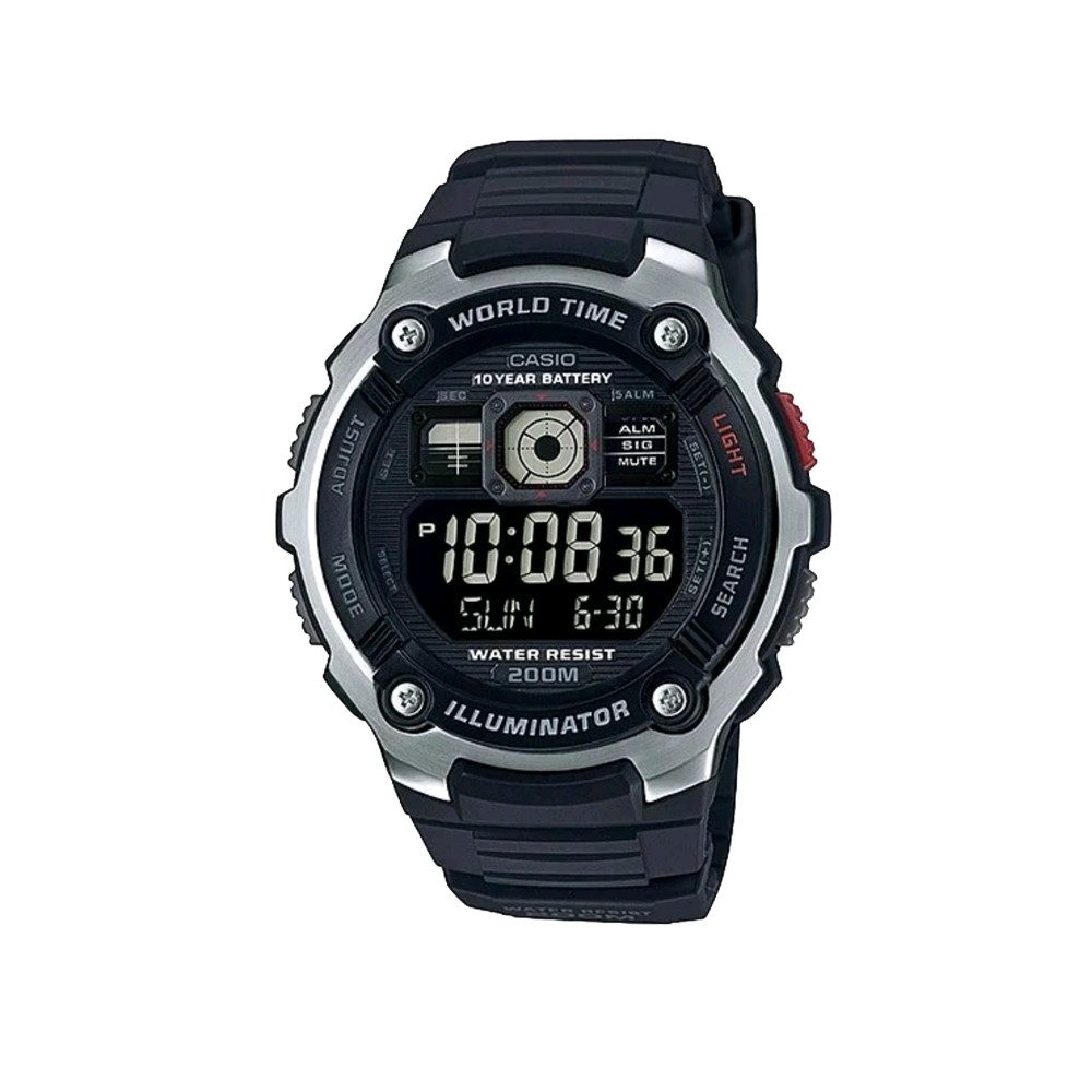 Casio AE-2000W-1BKelengkapan:- Kotak Casio- Buku Manual- Kartu Garansi Resmi 1 Tahunspesifikasi:Bahan case / bezel: Resin Resin Band Resin Kaca Tahan air 100 meter lampu LED Pencahayaan yang dapat dipilih (1,5 detik atau 3 detik), Afterglow Multi Time (4 kota berbeda) Waktu dunia 31 zona waktu (48 kota + waktu universal terkoordinasi) , daylight saving on / off, Home city / World time city swapping 1/100-detik stopwatch Mengukur kapasitas: 23: 59'59.99 '' Mengukur mode: Waktu yang berlalu, waktu split, 1st-2nd place times Penghitung waktu mundur Mengukur unit: 1 / 10 detik Jangkauan hitung mundur: 24 jam Jangkauan pengaturan waktu mulai mundur: 1 detik hingga 24 jam (kenaikan 1 detik, penambahan 1 menit dan peningkatan 1 jam)5 alarm harian atau alarm satu kali Sinyal waktu setiap jam Kalender otomatis penuh (hingga tahun 2099) Format 12/24-jam Tombol pengoperasian tombol on / off Ketepatan waktu teratur: Jam, menit, detik, pm, bulan, tanggal, hari Akurasi: ± 30 detik per bulan Approx. masa pakai baterai: 10 tahun pada CR2025Ukuran casing / Total berat Ukuran casing: 48,4 × 51,4 × 14,4mm Berat total: 49g