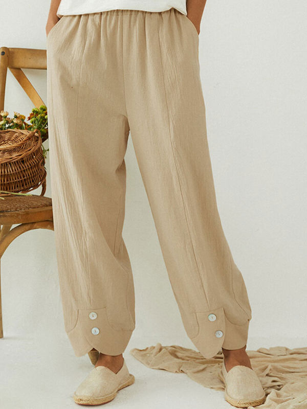 Casual Pocket Solid Color Elastic Waist Button Loose Pants