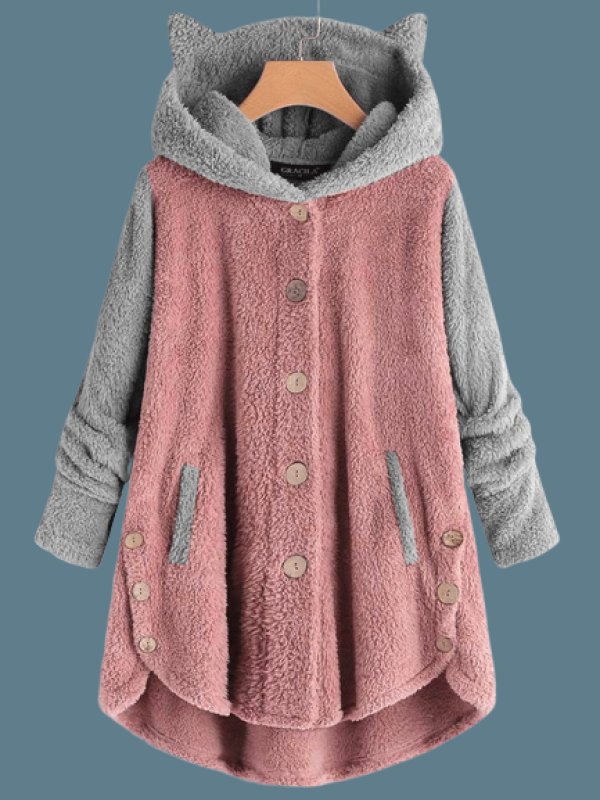 coats,cat ear plush colorblock button hoodie