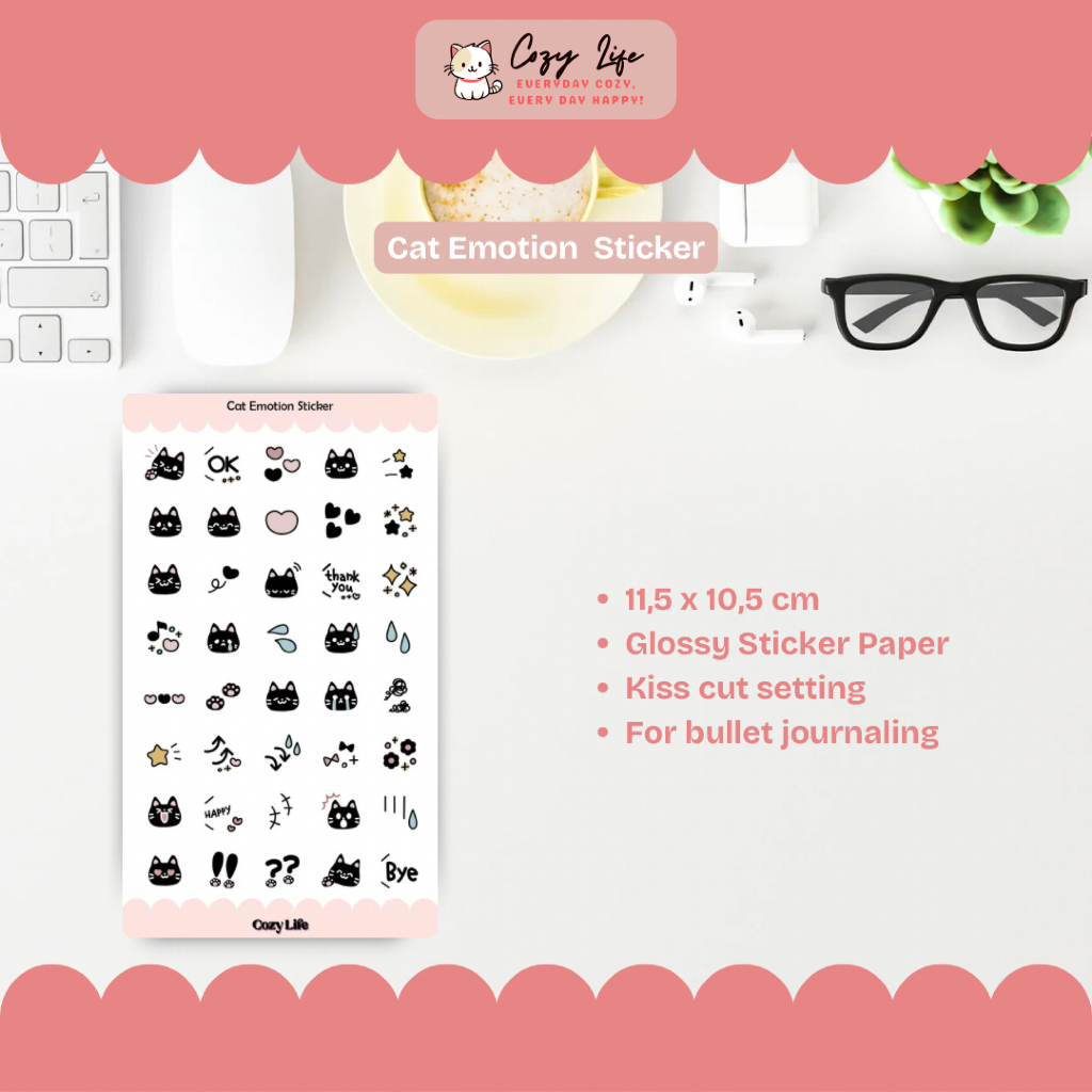 Tambahkan sentuhan lucu dan ekspresif ke jurnal atau planner-mu dengan Cat Emotion Sticker Set dari Cozy Life! Stiker ini menampilkan berbagai ekspresi kucing hitam yang menggemaskan, cocok untuk menghias bullet journal, agenda, atau sekadar memberikan aksen lucu pada barang kesayanganmu.