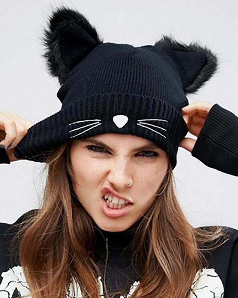 Cat Pattern Ear Design Fluffy Beanie, Black