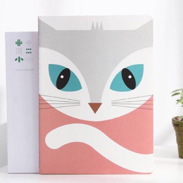 Buku tulis bergaris dengan sampul bergambar wajah kucing putih dan hitam.