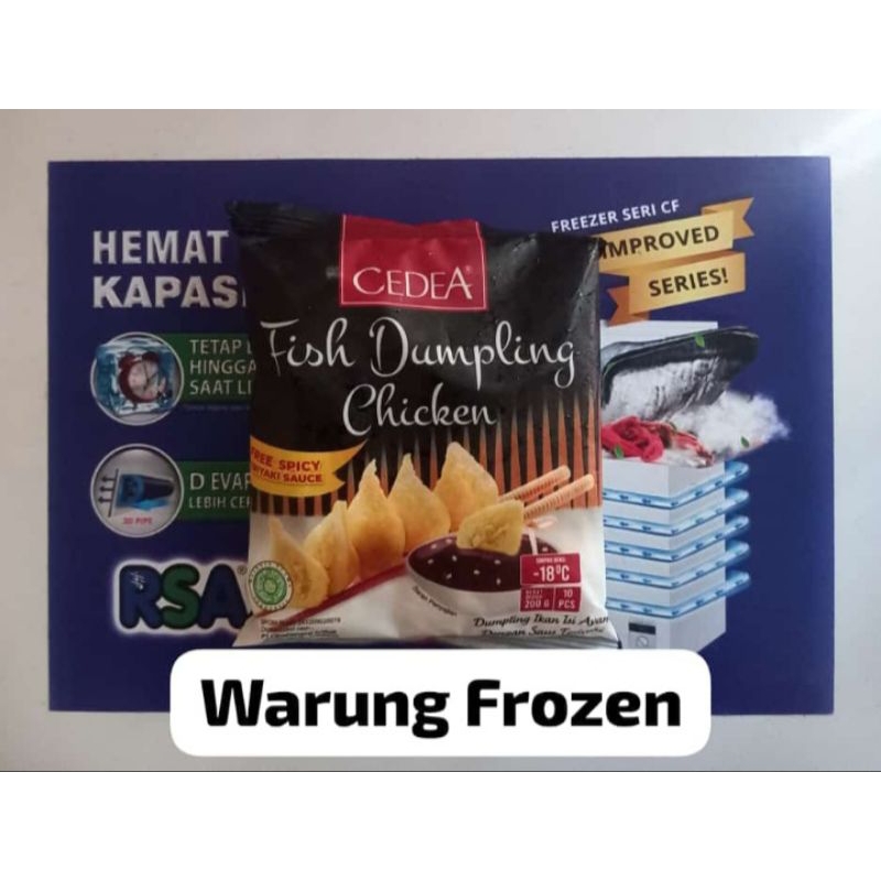 Cedea Fish Dumpling Chicken 200gr isi 10pcs dan gratis saus teriyaki di dalam kemasan. Penyimpanan di suhu freezer.