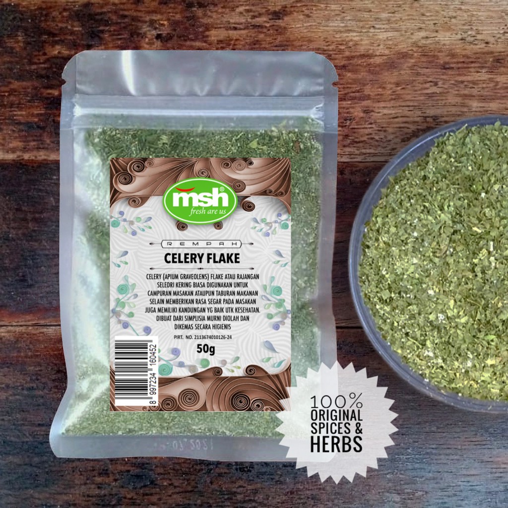 Celery (Apium Graveolens) Flake atau rajangan seledring merupakan bumbu rempah yang biasa digunakan untuk campuran masakan ataupun taburan makanan. Selain memberikan rasa segar pada masakan, Celery Flake ini juga memiliki kandungan yang baik untuk kesehatan. Dibuat dari simplisia murni yang diolah dan dikemas secara higienis.
