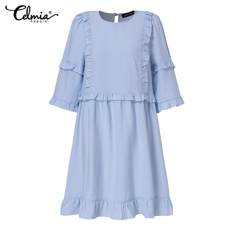 Celmia Лето Женская мода Оборки Праздник Короткое платье Половина Рукава O Шея Тонкие Твердые Повседневные Свободные Мини Платья Плюс Размер Kleid