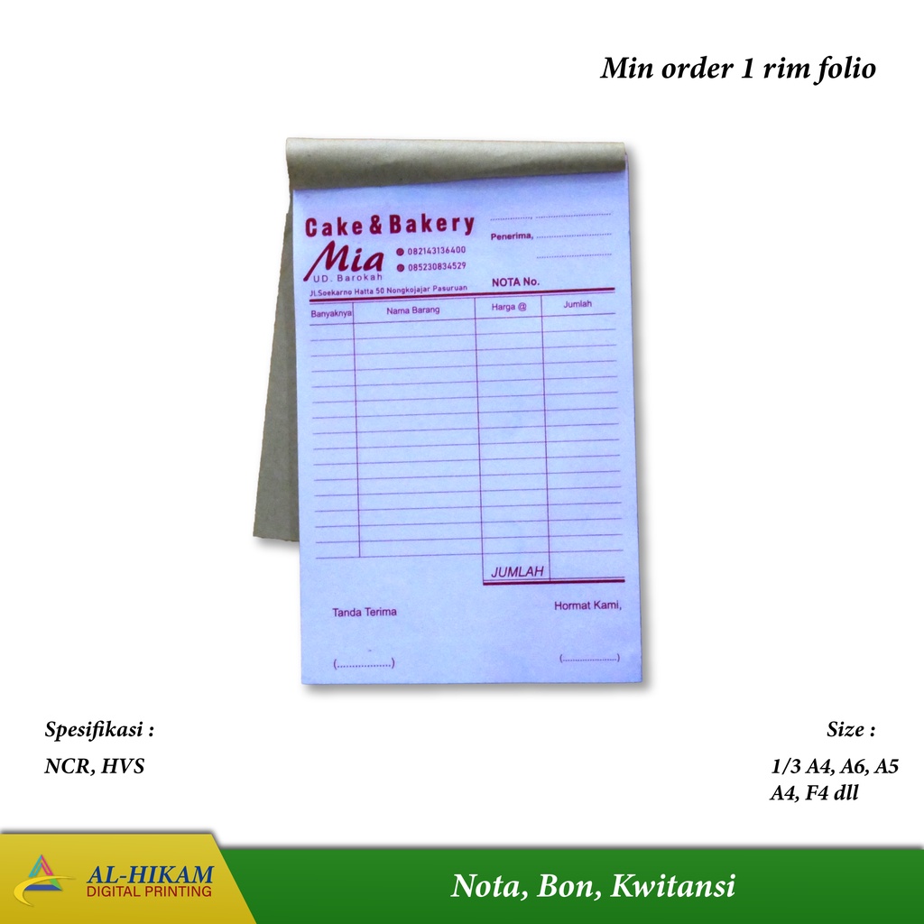Cetak Nota Offset / Bon / Kwitansi 1-4 Rangkap 1 RIM (500lbr)