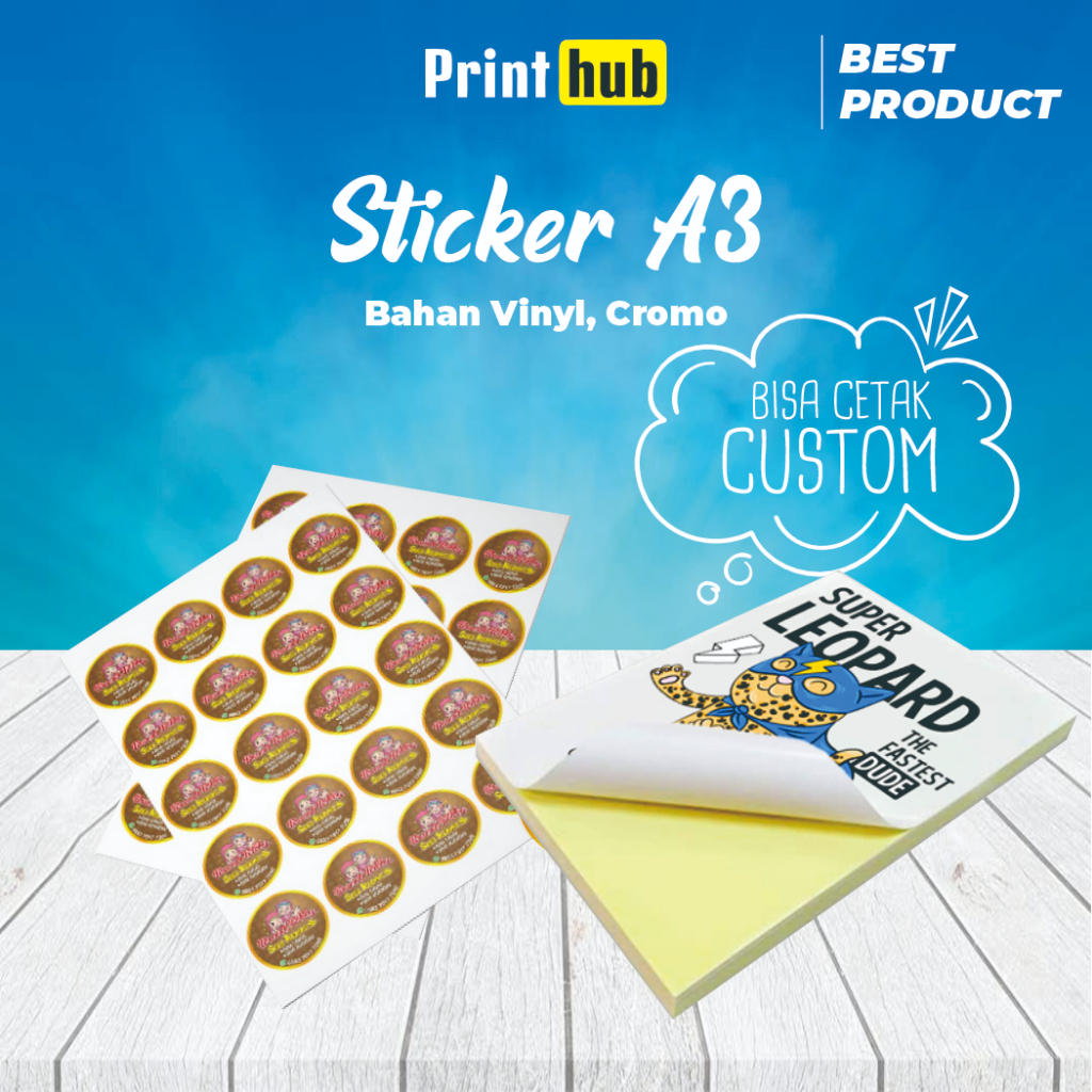 Ingin mencetak stiker berkualitas untuk kemasan produk atau kebutuhan lainnya? Kami menyediakan cetak stiker A3 dengan pilihan bahan Chromo dan Vinyl yang bisa disesuaikan dengan kebutuhan Anda. Dengan cetakan resolusi tinggi, stiker ini cocok untuk berbagai keperluan branding dan label produk.