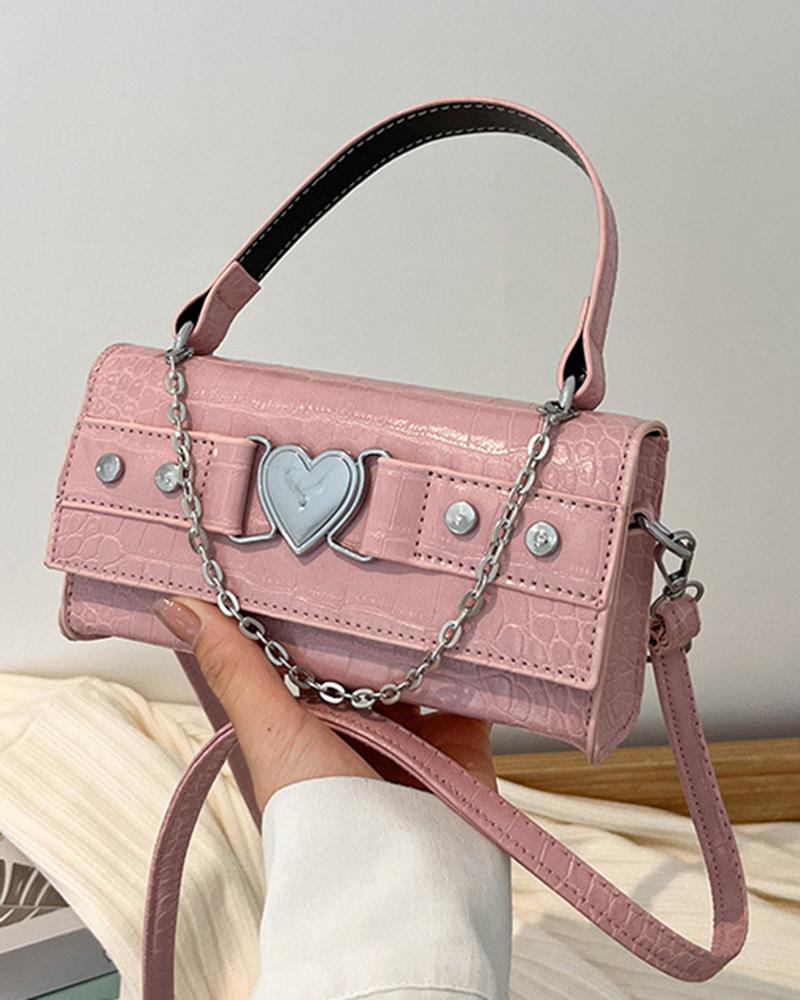 Chain Decor Heart Belted Rectangular Satchel Bag, Pink