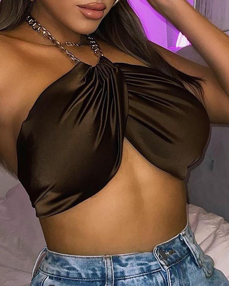 Chain Strap Halter Ruched Crop Top, Green