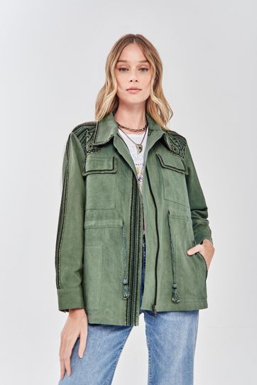 Chamarra de mujer confeccionada en gabardina, corte recto con cordón regulador en la cintura de hilo con tassels. Tiene detalles bordados a contratono con hilo y mostacillas en frente, bolsillos, mangas y hombros, y cierre frontal metálico. La clásica campera safari, reinterpretada en los códigos Rapsodia.