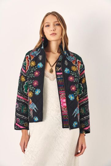 Chamarra matelasseada manga larga, con cuello subido. De estampa floral, tiene detalle de vivos a contratono en cuello, ruedo y mangas. Cerramiento delantero con cierre metálico.Un abrigo de media estación para sumar color a tus outfits.