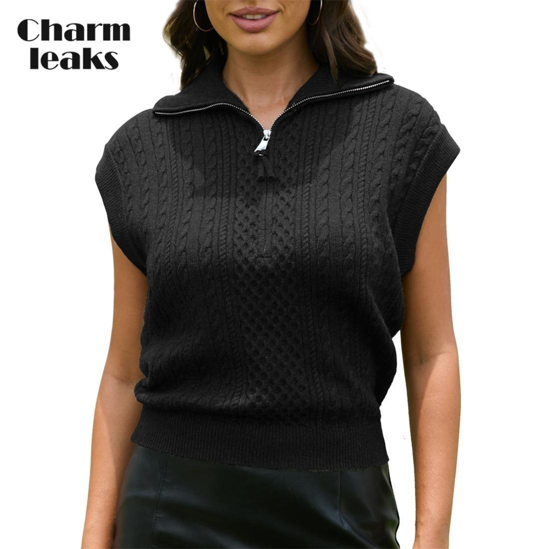 Charmleaks Cable Knit укороченный свитер жилет женский с воротником-стойкой и застежкой-молнией на четверть длины свитер без рукавов осень 2024 г. S чёрный