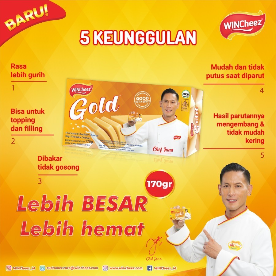 Keju Block WINCheez GOLD 170 Gram merupakan produk keju cheddar olahan dengan kualitas GOLD yang dikemas dalam kemasan 170 Gram dapat digunakan sebagai bahan baku dalam pengolahan makanan.