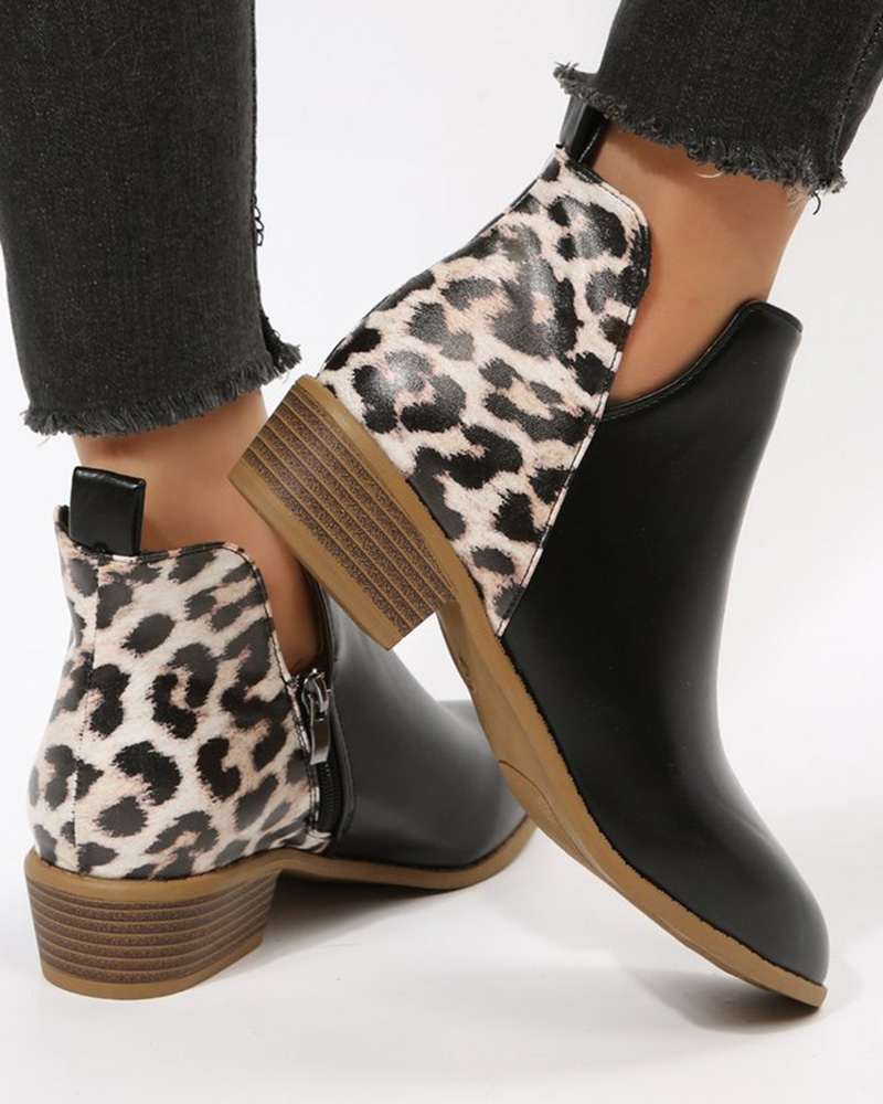 Cheetah Colorblock Slit Ankle Boots, Black&leopard