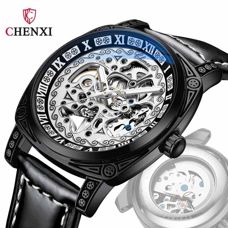 CHENXI Полые Наручные часы из Натуральной Кожи Водонепроницаемые Светящиеся Ретро Резной Скелетон Мужские Часы Роскошные Винтажные Автоматические Механические Часы чёрный