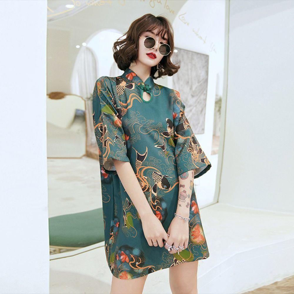 Cheongsam с принтом благоприятной облачной рыбы и лотоса, платье с короткими рукавами, женская одежда в стиле ретро, народный танец