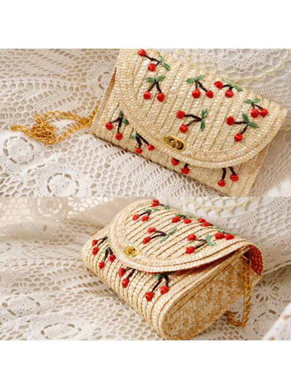 bags,cherry embroidered woven flap clutch bag