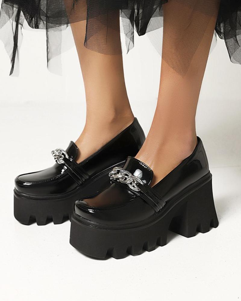 Chic Ladies Interlocking Rings Decor Round Toe Shiny Finish Platform Shoes, Black