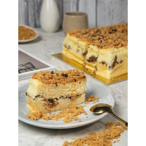 Kue bolu dengan taburan abon ayam.