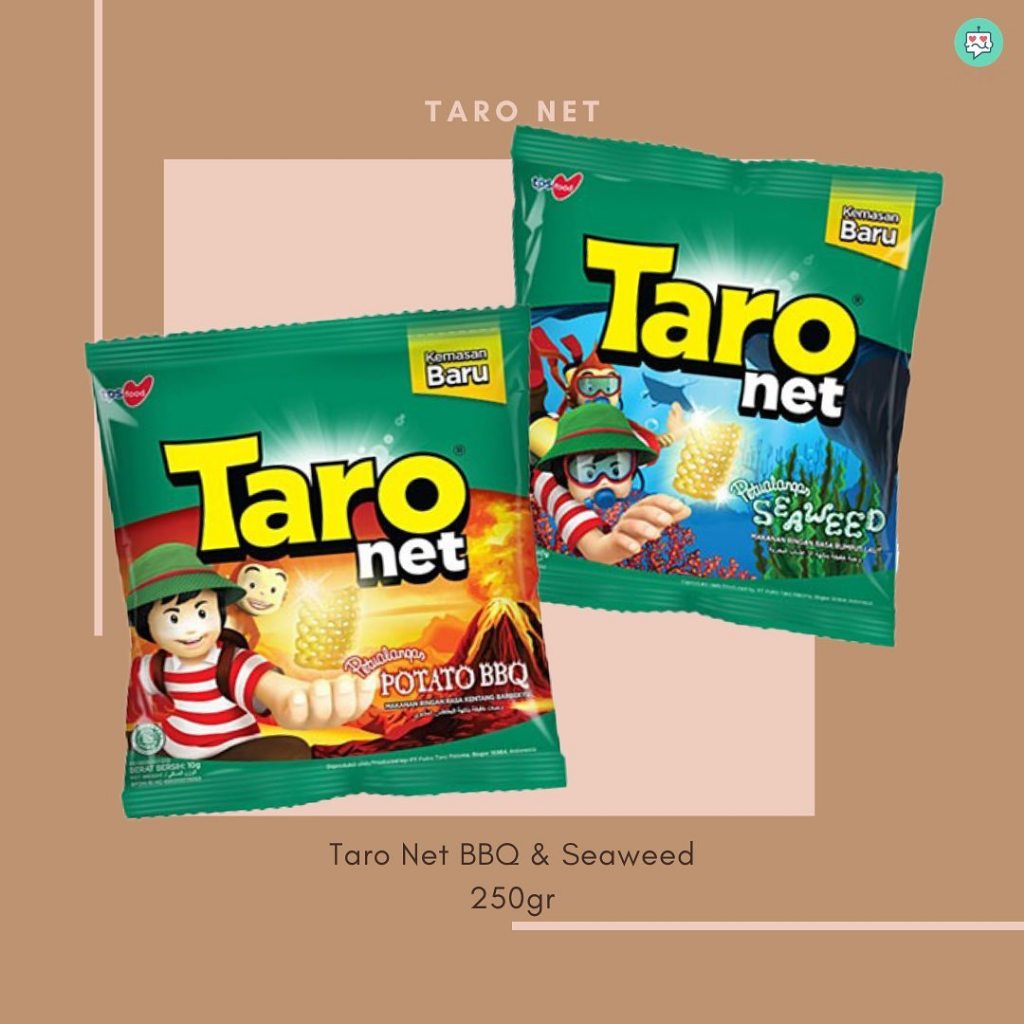 Taro Net, makanan ringan berbentuk seperti jaring. Bernetto 9 gram. Ber BPOM dan Halal MUI. dijual per renceng isi 10 bks