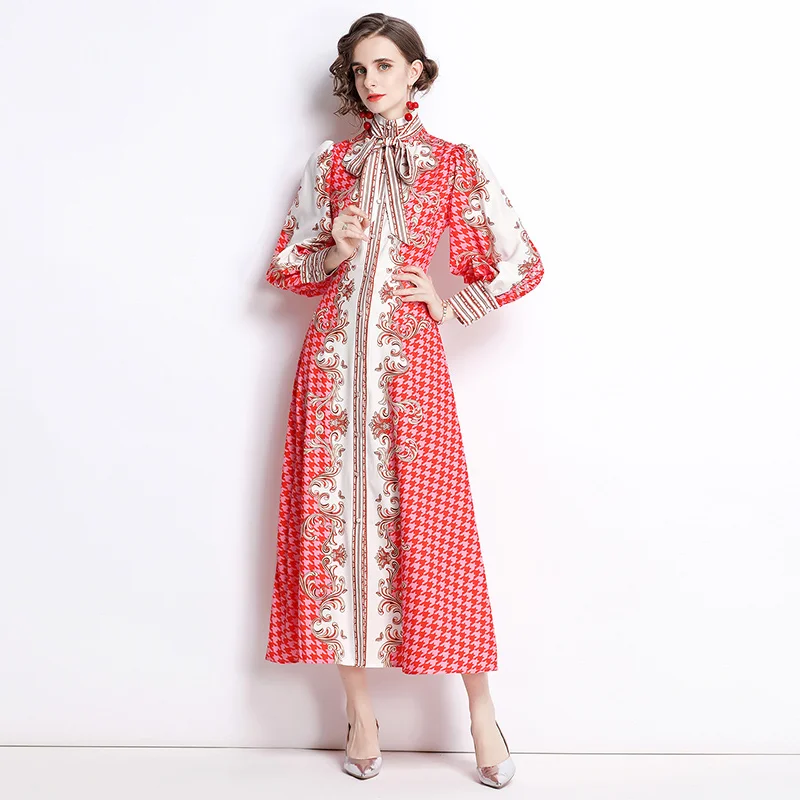 Chikichi 2021 Европейская станция Осень женское Новое модное и элегантное тонкое красное шифоновое платье-трапеция с длинным рукавом и принтом д...